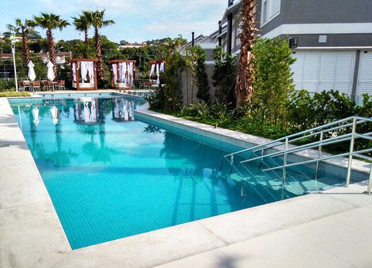 - Escada de acessibilidade: os degraus de acesso à piscina devem ter corrimãos nas laterais. Além disso, a escada deve possibilitar que idosos, obesos e cadeirantes possam acessas a piscina sem dificuldades.