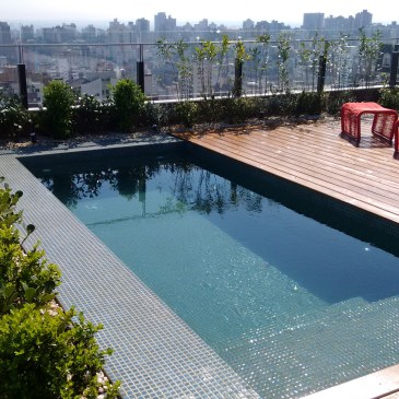 Revestida de pastilhas cerâmicas 2,5×2,5cm esta piscina conta com aquecimento solar e borda revestida em pastilhas e deck de madeira. … Mais Piscina de concreto com aquecimento solar em cobertura em Porto Alegre/RS.